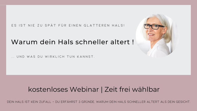 Kostenlose Anmeldung zum Webinar " Warum dein Hals schneller altert,... Den Zeitpunkt, wann du das Webinar anschaust, wählst du anschliessend selbst aus.